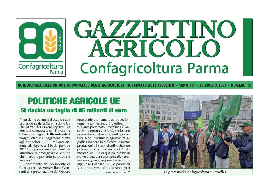 Pubblicato il numero 15/2025 del Gazzettino Agricolo, il quindicinale di Confagricoltura Parma con le principali