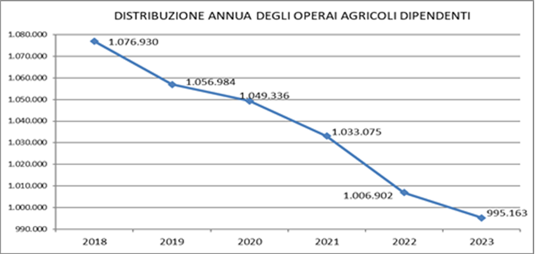 A livello territoriale, nell’ultimo anno, il maggior decremento in percentuale si è registrato in Emilia – Romagna ed in Abruzzo con un calo del 6,9%. In controtendenza il Friuli-Venezia Giulia (+1,5%) ed il Veneto (+0,6%) che segnalano sul 2022 un leggero incremento degli addetti. I lavoratori agricoli con qualifica operaia passano da 1.006.902 nel 2022 a 995.163 nel 2023, con una diminuzione di 11.700 unità (-1,2%), scendendo per la prima volta dal 2007 sotto il milione di unità.