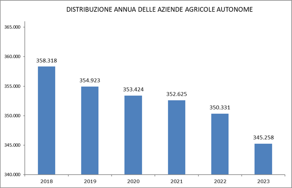 Il numero di aziende agricole nella gestione INPS degli autonomi (coltivatori diretti e IAP) passa da 350.331 dell’anno 2022 a 345.258 del 2023, registrando una diminuzione del 1,4%. Il calo complessivo 2018 – 2023 e di -13.060 unità, con una diminuzione del 3,6%.