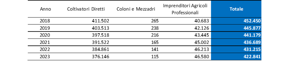I dati INPS relativi al mondo agricolo, resi pubblici nel novembre 2024, attestano un rilevante calo degli addetti del comparto, siano essi dipendenti che imprenditori. I dati statistici sono riferiti all’anno 2023.