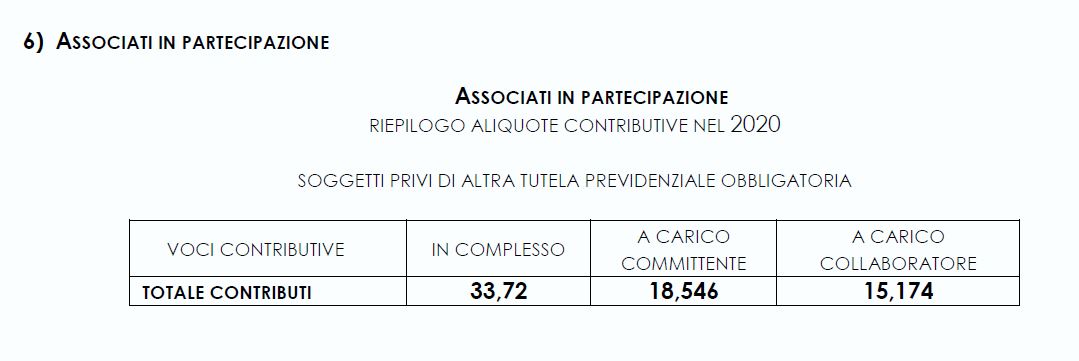 Le norme contributive innanzi viste per i Co.Co.Co. sono applicate anche agli associati in partecipazione con conferimento di lavoro che, ai sensi dell’art. 43 della legge n. 326/2003, come noto, sono tenuti all’iscrizione, sin dal 1° gennaio 2004, nella gestione separata (ex art. 2, c. 26, legge n. 335/95). Pertanto, anche per tale categoria di soggetti le aliquote contributive pensionistiche per l’anno 2020 sono quelle in vigore per i collaboratori indicate nel paragrafo precedente. A differenza dei collaboratori, per gli associati in partecipazione, con conferimento di lavoro, la ripartizione dell’onere contributivo viene confermata nel 55% a carico dell’associante e nel 45% a carico dell’associato. Si ricorda che con il d.lgs. n. 81/2015 (Jobs Act) è stata vietata la stipula di nuovi contratti di associazione in partecipazione con apporto di lavoro a decorrere dal 15 giugno 2015.