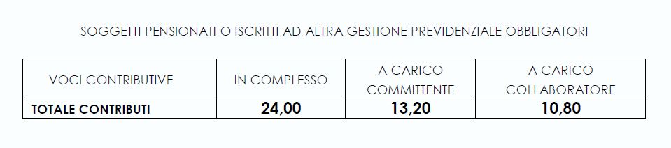Per l’anno 2020 le aliquote contributive valide ai fini del calcolo pensionistico della gestione separata sono fissate nel: 33% per li iscritti alla gestione separata che non siano assicurati anche presso altre forme pensionistiche obbligatorie; 25% per i lavoratori autonomi titolari di partita IVA che non siano assicurati anche presso altre forma pensionistiche obbligatorie; 24% per tutti gli altri iscritti alla gestione separata e cioè per i soggetti assicurati anche presso altre forme pensionistiche obbligatori e per quelli già titolari di pensione, nonché nel 33% per il lavoro occasionale ex art. 54 bis della legge n. 96/2017.