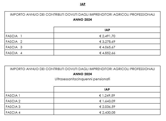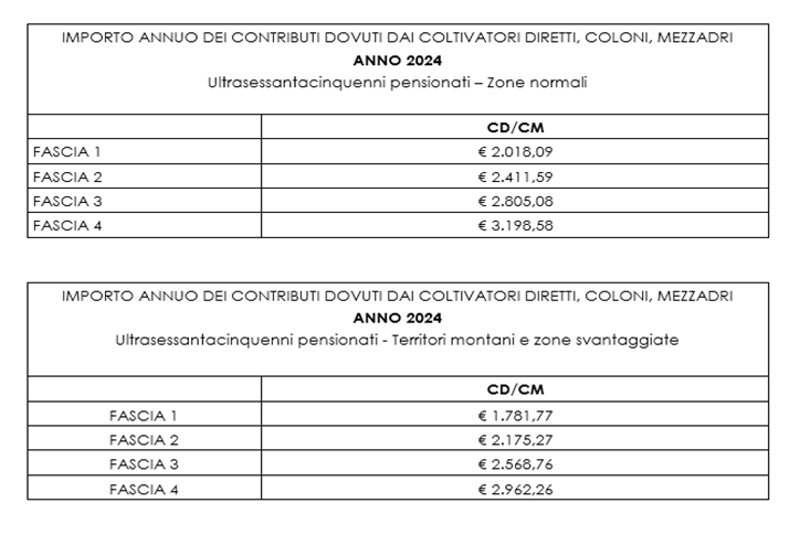 Ciascuna azienda è inclusa annualmente nella fascia di reddito convenzionale corrispondente al reddito agrario dei terreni condotti e/o a quello determinato dall’allevamento degli animali. La contribuzione INPS dovuta è determinata sulla base del reddito medio convenzionale, stabilito annualmente con Decreto del Ministero del Lavoro e delle Politiche Sociali. Previste riduzioni per gli ultrasessantacinquenni; il reddito medio, per l’anno 2024, è fissato in euro 63,06. L’aliquota INPS da applicare è, per tutte le zone e fasce, pari al 24%.  L’importo del contributo addizionale IVS per ciascuna unità attiva iscritta nella gestione previdenziale INPS è pari ad 0,79 a giornata e per n° 156 giornate annue.