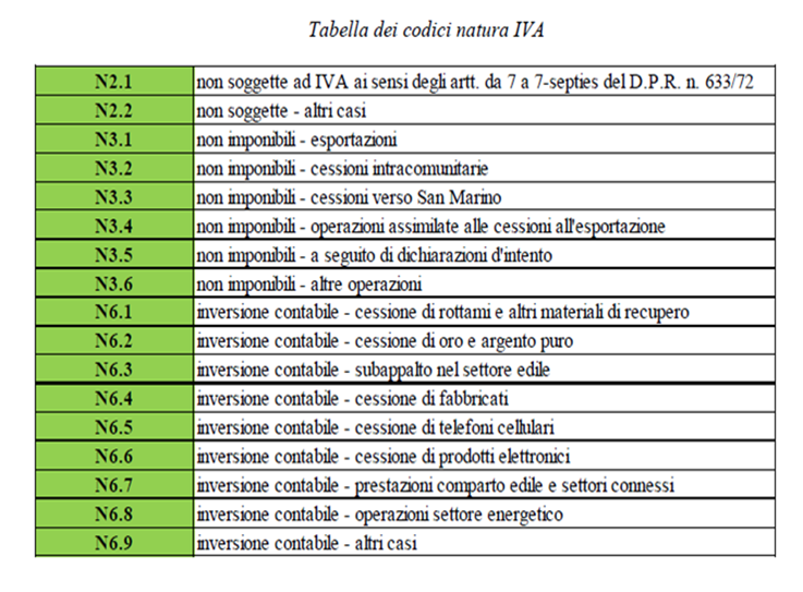 • l’indicazione di dettaglio delle classificazioni più significative per le operazioni attive senza computo dell’imposta sul valore aggiunto: N2 operazioni non soggette; N3 non imponibili; N6 inversione contabile;