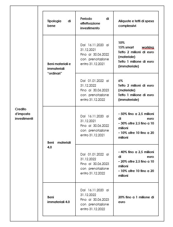 - nella misura del 10% del costo di acquisizione, elevata al 15% per gli investimenti in strumenti e dispositivi tecnologici destinati dall’impresa alla realizzazione di modalità di lavoro agile (smart working) per gli investimenti effettuati, nel limite massimo di costi ammissibili pari a 2 milioni di euro ovvero a 1 milione di euro, rispettivamente, per quelli in beni strumentali materiali diversi da quelli indicati nella predetto allegato A e per quelli in beni strumentali immateriali diversi da quelli indicati nell’allegato B, nel periodo temporale che va dal 16/11/2020 al 31/12/2021 ovvero entro il 30/6/2022, a condizione che entro la data del 31/12/2021 il relativo ordine risulti accettato dal venditore e sia avvenuto il pagamento dell’acconto pari ad almeno il 20% del costo di acquisizione;
