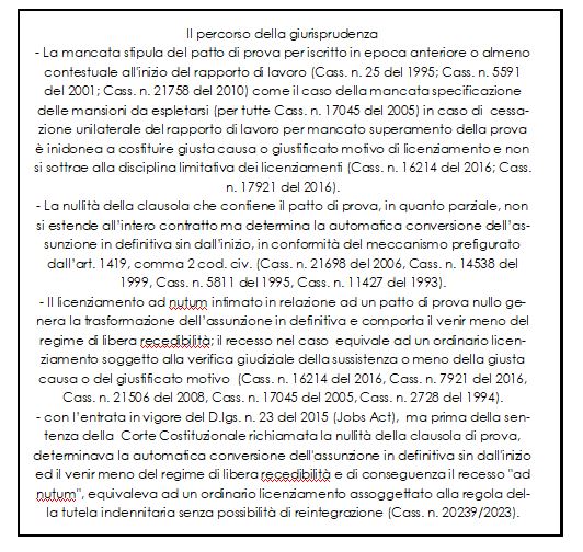 La pronunzia della Cassazione in commento contiene una interessante disamina della questione del patto di prova analizzata nel tempo sotto numerosi profili richiamando sentenze anche remote – ad esempio la Corte ha sancito (Cass. n. 21996/2023) che per la valutazione di specificità del patto di prova occorre considerare la non necessità di descrizione in dettaglio delle singole mansioni in presenza di svolgimento di attività di contenuto intellettuale, (Cass. n. 17591 del 2014), la possibilità di rinvio per relationem al contratto collettivo applicabile (Cass. n. 9597 del 2017, Cass. n. 11722 del 2009) e, ai fini dell’interpretazione del contratto, l’utilizzo di elementi extratestuali ricavabili dalla condotta delle parti, quali il pregresso bagaglio lavorativo esplicitato nel curriculum, ritenuto consentito (Cass. n. 553/2022, Cass. n. 24560/2016, Cass. n. 16181/2017) – valutando i principi testè riassunti, unitamente alle conseguenze sulla nullità genetica del patto di prova, tenendo in considerazione la sentenza della Corte Costituzionale n. 128 del 2024 con la quale è stata dichiarata la illegittimità costituzionale dell’art. 3 co. 2 del D.lgs. n. 23 del 2015 nella parte in cui non prevede che la reintegra attenuata trovi applicazione anche nelle ipotesi di licenziamento per giustificato motivo oggettivo in cui sia direttamente dimostrata, in giudizio, l’insussistenza del fatto materiale allegato dal datore di lavoro.