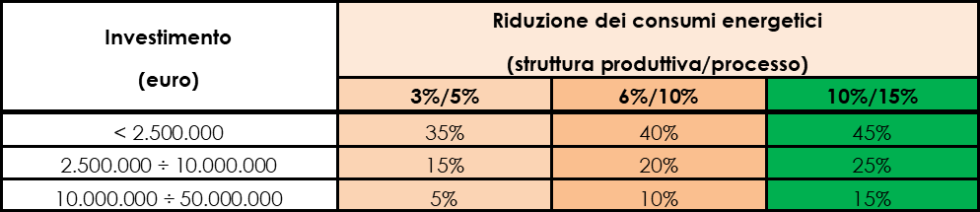 Con tale strumento viene riconosciuto un credito d’imposta alle imprese che effettuano nuovi investimenti in strutture produttive, nell’ambito di progetti di innovazione da cui consegua una riduzione dei consumi energetici.