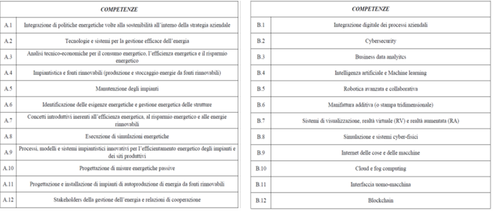 Al fine di acquisire o consolidare le competenze nelle tecnologie rilevanti per la transizione energetica e digitale dei processi produttivi, i percorsi di formazione prevedono lo svolgimento di uno o più moduli negli ambiti formativi individuati nell’Allegato 2 a condizione che, nel medesimo percorso, sia incluso: a) almeno un modulo formativo di durata non inferiore a 4 ore tra quelli individuati nell’Allegato 2 alle lettere da A1 ad A4 per le competenze nelle tecnologie rilevanti per la transizione energetica dei processi produttivi; b) almeno un modulo formativo di durata non inferiore a 4 ore tra quelli individuati nell’Allegato 2 alle lettere da B1 a B4 per le competenze nelle tecnologie rilevanti per la transizione digitale dei processi produttivi.