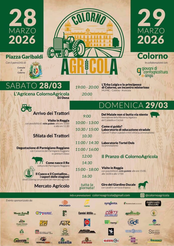 Torna sabato 28 e domenica 29 marzo Colorno Agricola, la festa dell’agricoltura organizzata dai giovani imprenditori agricoli colornesi insieme ad Anga-Confagricoltura Parma, con la collaborazione di Confagricoltura Parma, il patrocinio del Comune di Colorno e il sostegno di numerosi sponsor locali.