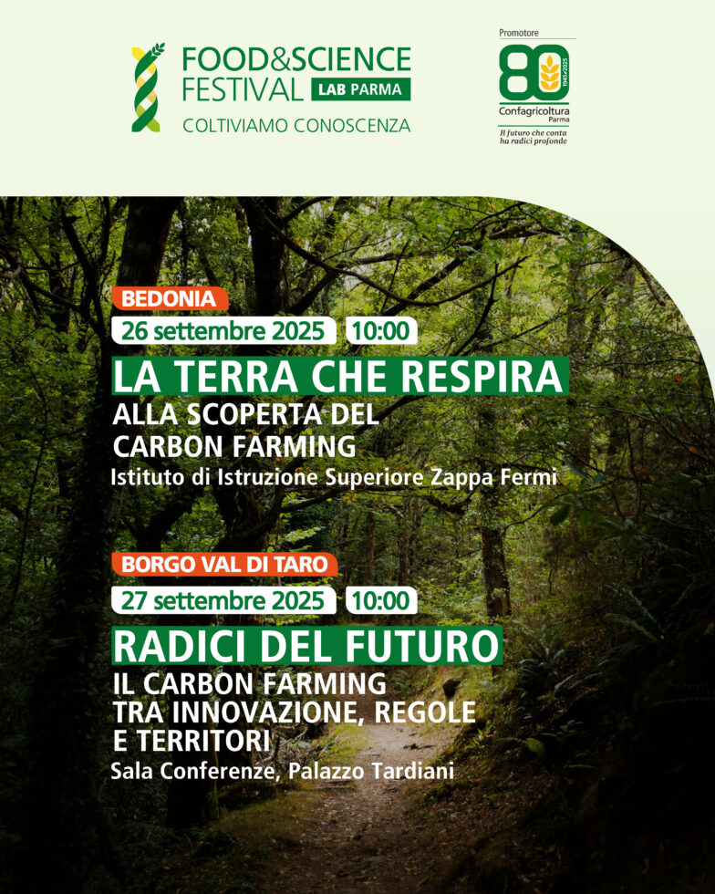 Sabato 27 settembre invece ecco “Radici del futuro. Il carbon farming tra innovazione, regole e territori”, il convegno in programma alle ore 10 a Borgo Val di Taro (sala conferenze di Palazzo Tardiani). La mattinata sarà aperta dai saluti iniziali di Marco Moglia, sindaco di Borgo Val di Taro, e Fabio Bonatti, consigliere della Provincia di Parma con delega ad Attività produttive e Rapporti con le associazioni economiche. Spazio poi al dibattito, moderato da Enrica Favaro di Frame – Divagazioni scientifiche, che permetterà di aprire uno spazio di confronto sui crediti di carbonio, fra normative vigenti, opportunità a disposizione del settore agricolo, strumenti di monitoraggio avanzati e modelli gestionali.