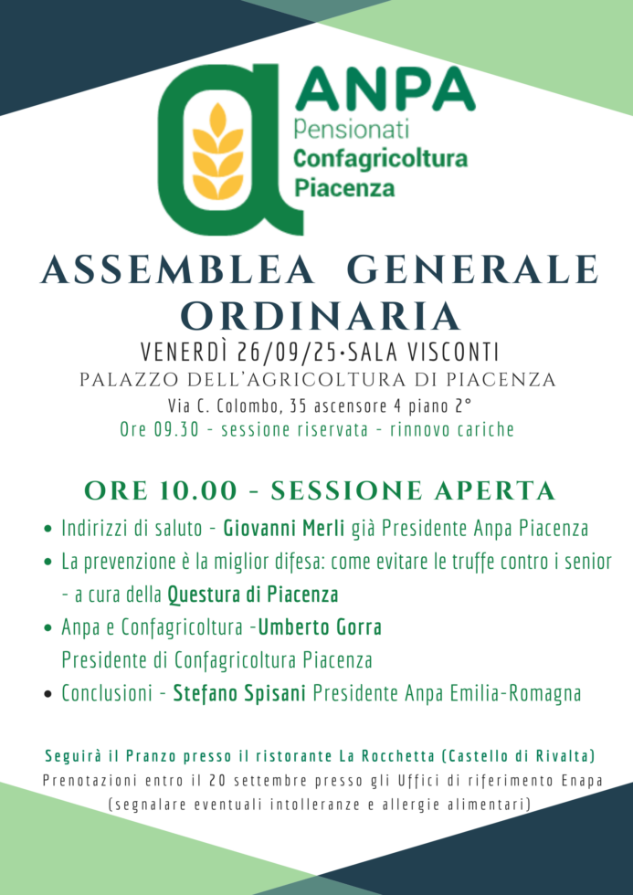 Anpa – Associazione Pensionati di Confagricoltura Piacenza venerdì 26 in Assemblea generale